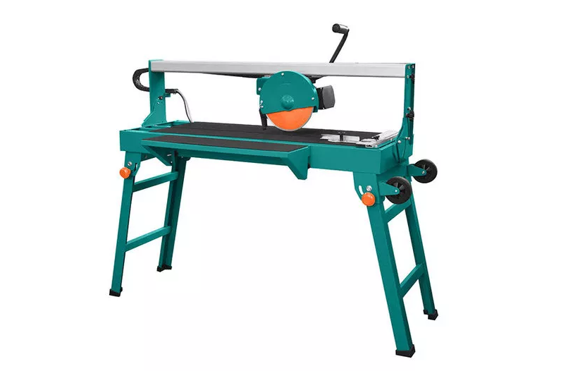 Сталевий стіл розміром 1260×460 мм дозволяє виконувати прямі та косі різи (від 0° до 45°). Робоча поверхня оснащена гумовими накладками для фіксації плитки, а знімна конструкція стільниці полегшує обслуговування і очищення піддону з водою. Водяне охолодження запобігає перегріванню диска й покращує якість різу.